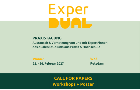 Wir laden Sie herzlich ein, sich mit Ihrer Expertise an der ExperDual 2027 zu beteiligen! Reichen Sie bei Interesse bitte Ihren Vorschlag für einen Workshop oder ein Poster bei uns ein.