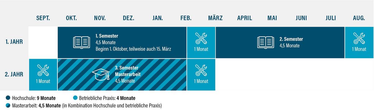 Der Master, organisiert als Studium mit vertiefter Praxis, dauert 1,5 (3 Semester) in Vollzeit. Mindestens 34 Wochen (bzw. mindestens die Hälfte der Regelstudienzeit) verbringen die Studierenden im Unternehmen, dies vorwiegend in den Semesterferien und in der Zeit während der betriebsnahen Masterarbeit, die den Höhepunkt und Abschluss des Studiums bildet.